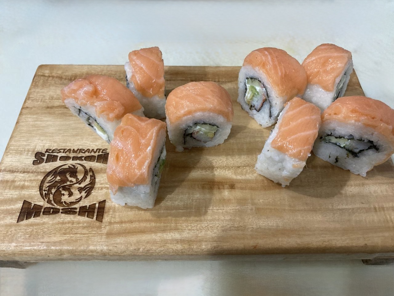 Relleno de queso crema, pepino, cangrejo y aguacate, cubierto con salmón por fuera. Suave, fresco y lleno de sabor.